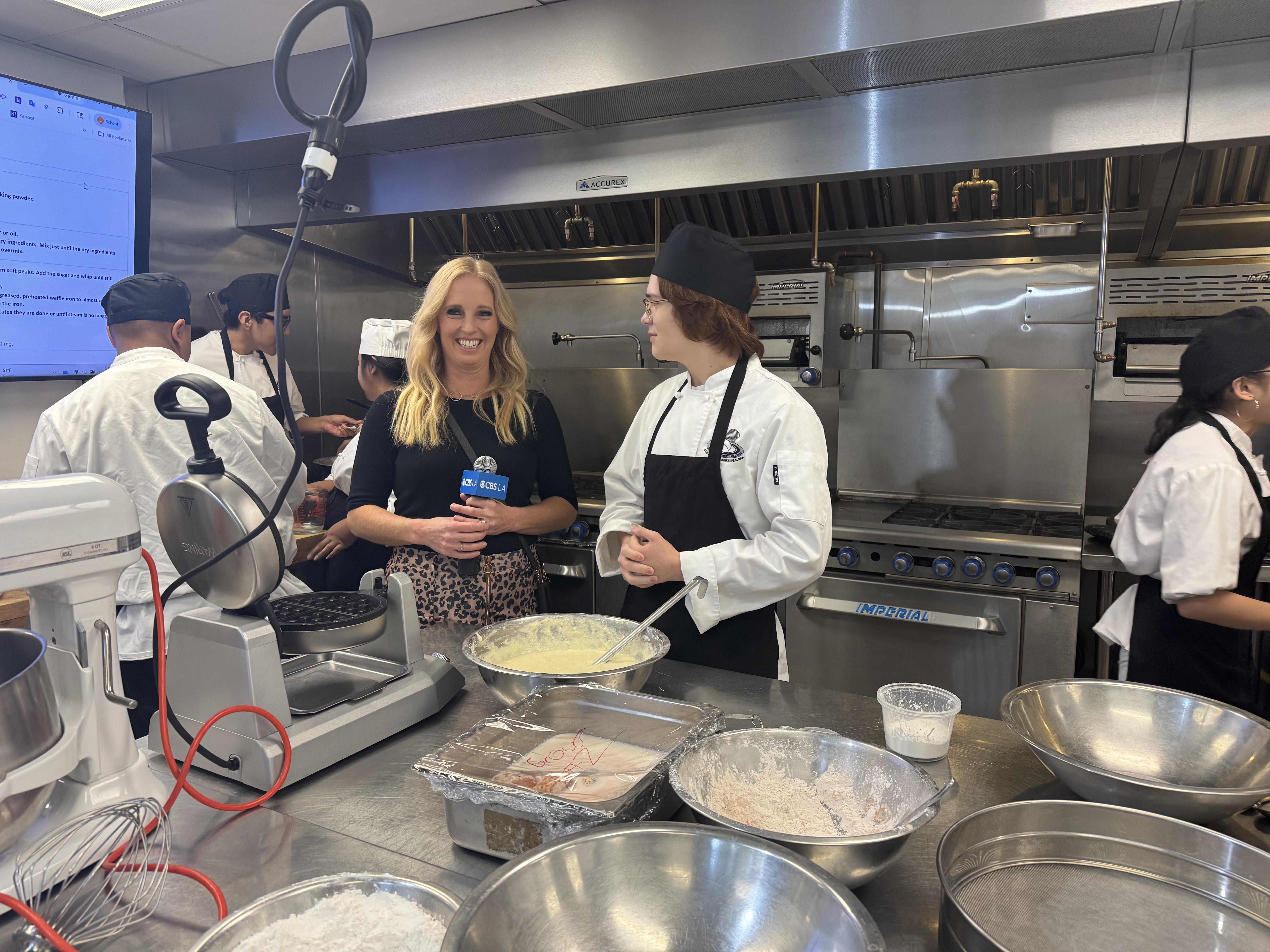 In Culinary Arts, students and staff welcomed the crew into the kitchen for a live feature. Students Daniel and Tran spoke about the skills they are developing, while instructor Brandon Palmer highlighted the industry aligned course. A short live clip aired during the broadcast also featured students from Sierra Vista High School working alongside Baldwin Park High students, showcasing cross-campus collaboration. CBS News LA host Jasmine Vail sampled the dish of the day—fresh fried chicken and waffles—and went back for a second bite.